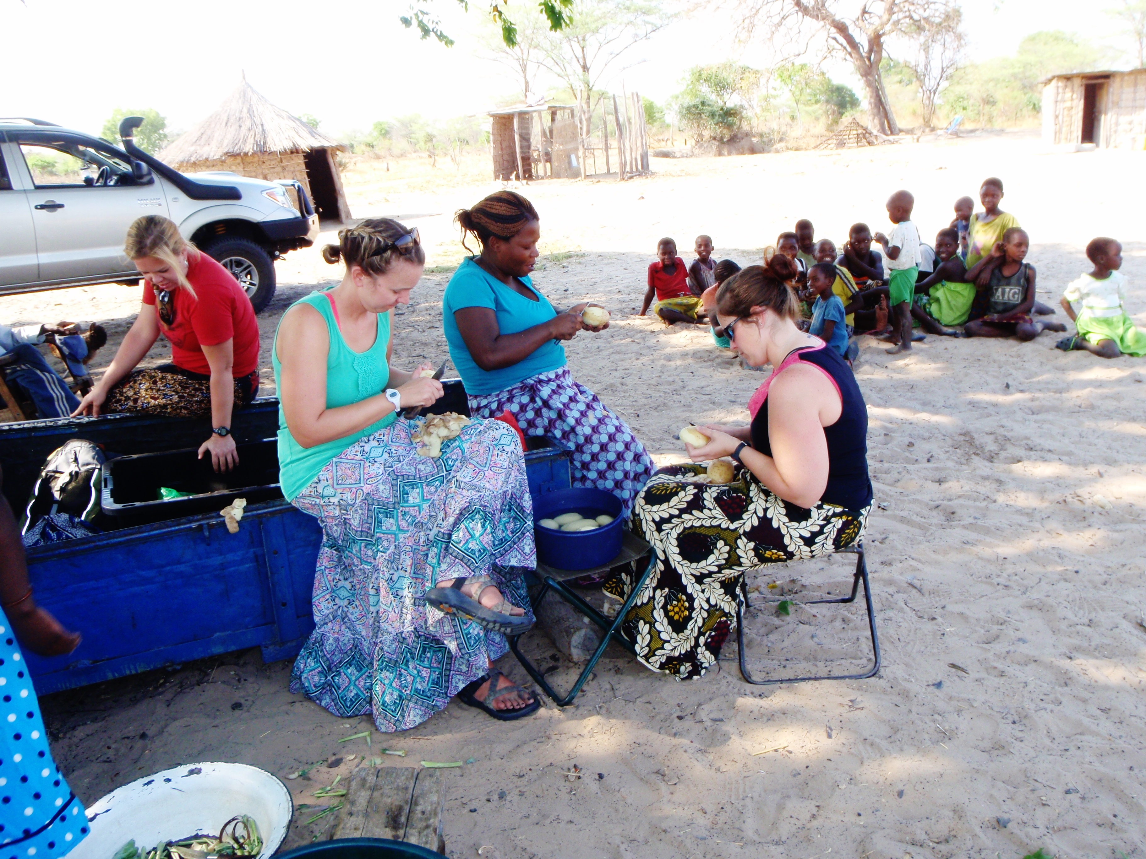We went back to Capalingwa for a couple of hours (we got there late). My group went to 3 huts. At the second, we had our first and only real transformation. There was a man and two women, and as we talked to them, we discovered that though they went to church, they didn’t know God as Father. So we explained what it meant to have a relationship with Him, and they all prayed to accept Him as Lord. The man especially was very enthusiastic and happy about it. After finishing hut to hut, we went back to the center of Capalingwa where we spent time and prepared a meal with the people. Other than a yummy type of fruit (known as monkey brains) and the Hungry Lion, this was our only experience with Zambian food, and it was all good. Maize (corn) is a staple food in the villages, which they use to make something called nshima. They take the dried kernels off the cob (which we got to help them do a little yesterday), and grind them into a meal. They then boil it with water until it thickens into a consistency similar to dough, so it is very filling. It is eaten by forming it into small patties with your hands (I learned the hard way that you’re supposed to do it with only one hand…if you roll it using both, they laugh at you) and dipping it into relishes. The ones we had were stewed tomatoes and onions, a creamy one made with rape leaves and ground nuts (similar in taste and consistency to a spinach dip), and something like a stew with potatoes and carrots. They also made Zambian fried chicken. Everything was delicious.